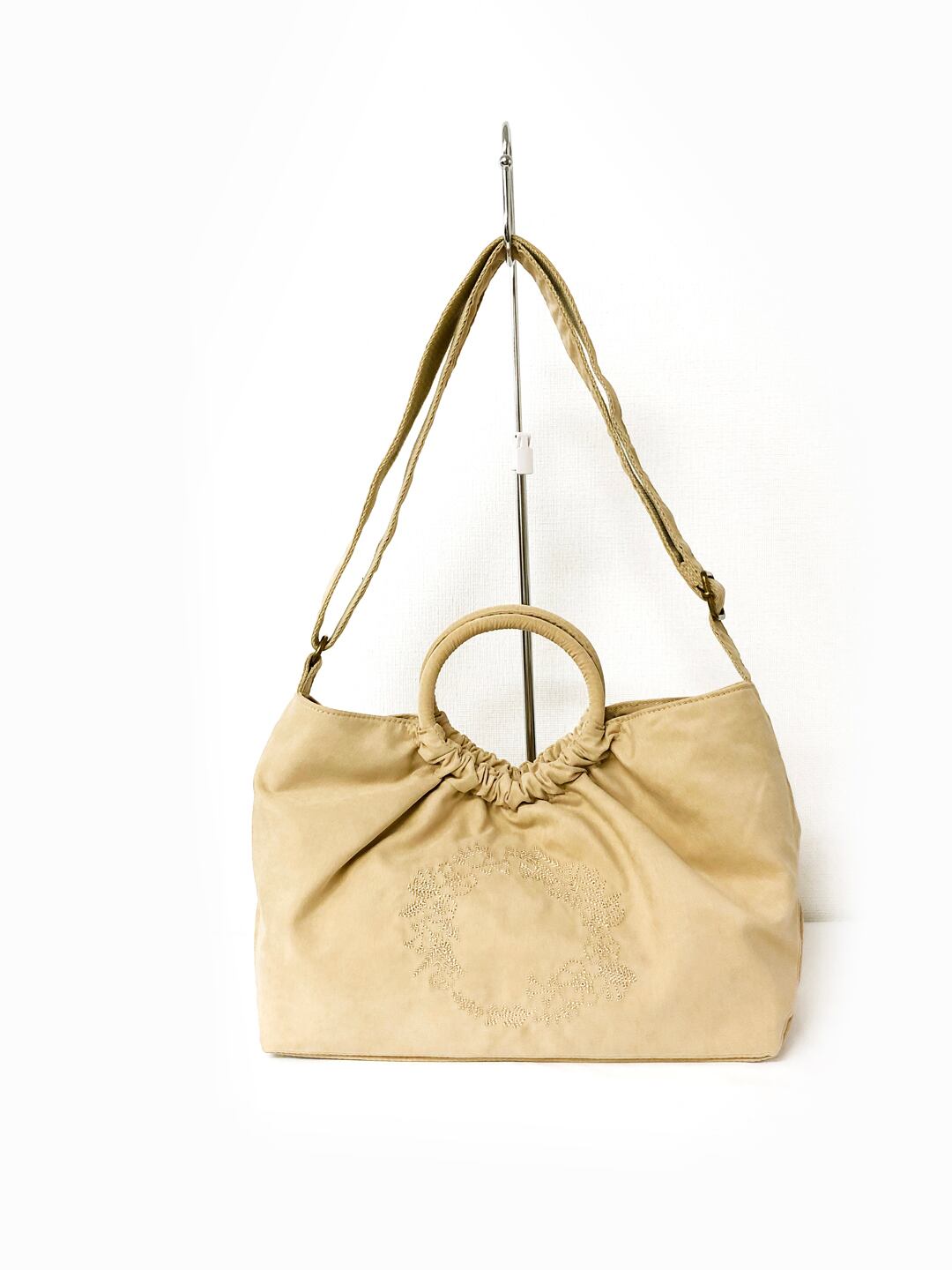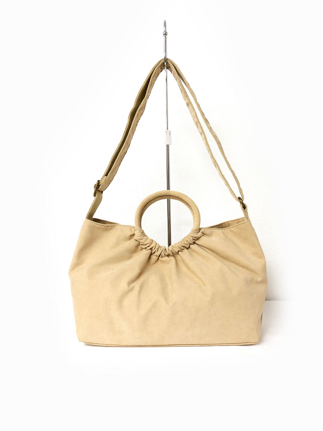 ◇ピーチスキン風刺?と可愛い持ち手が特徴の2WAYバッグ。取り外し可能なショルダーベルトで2通りのお洒落を楽しめます。