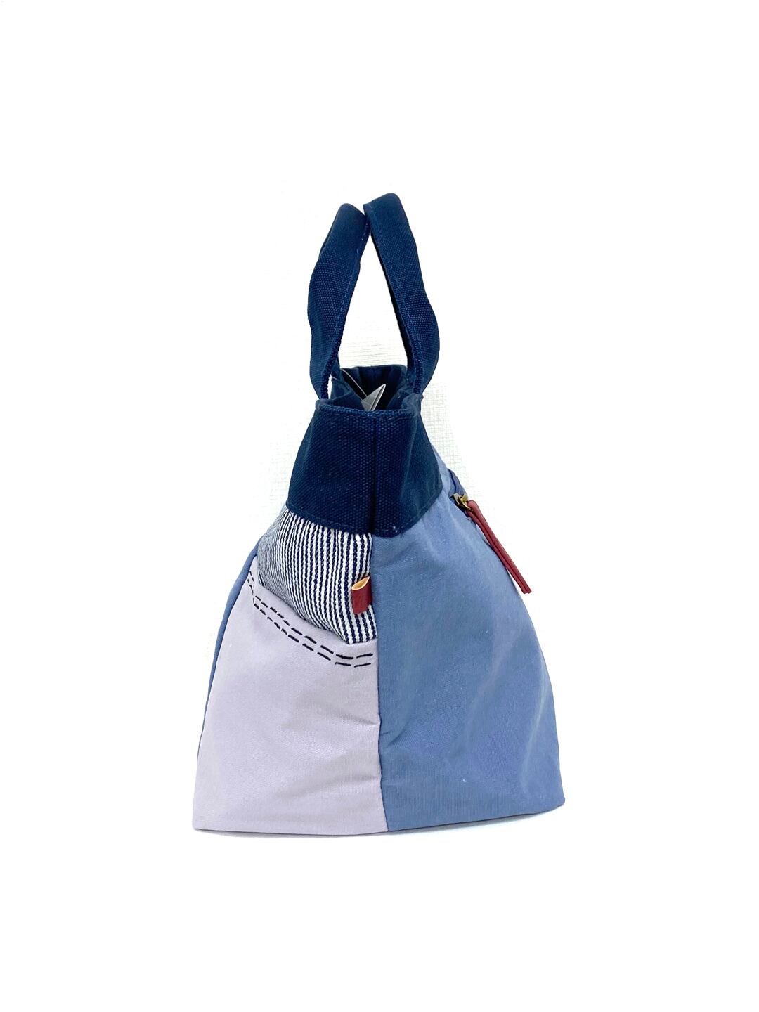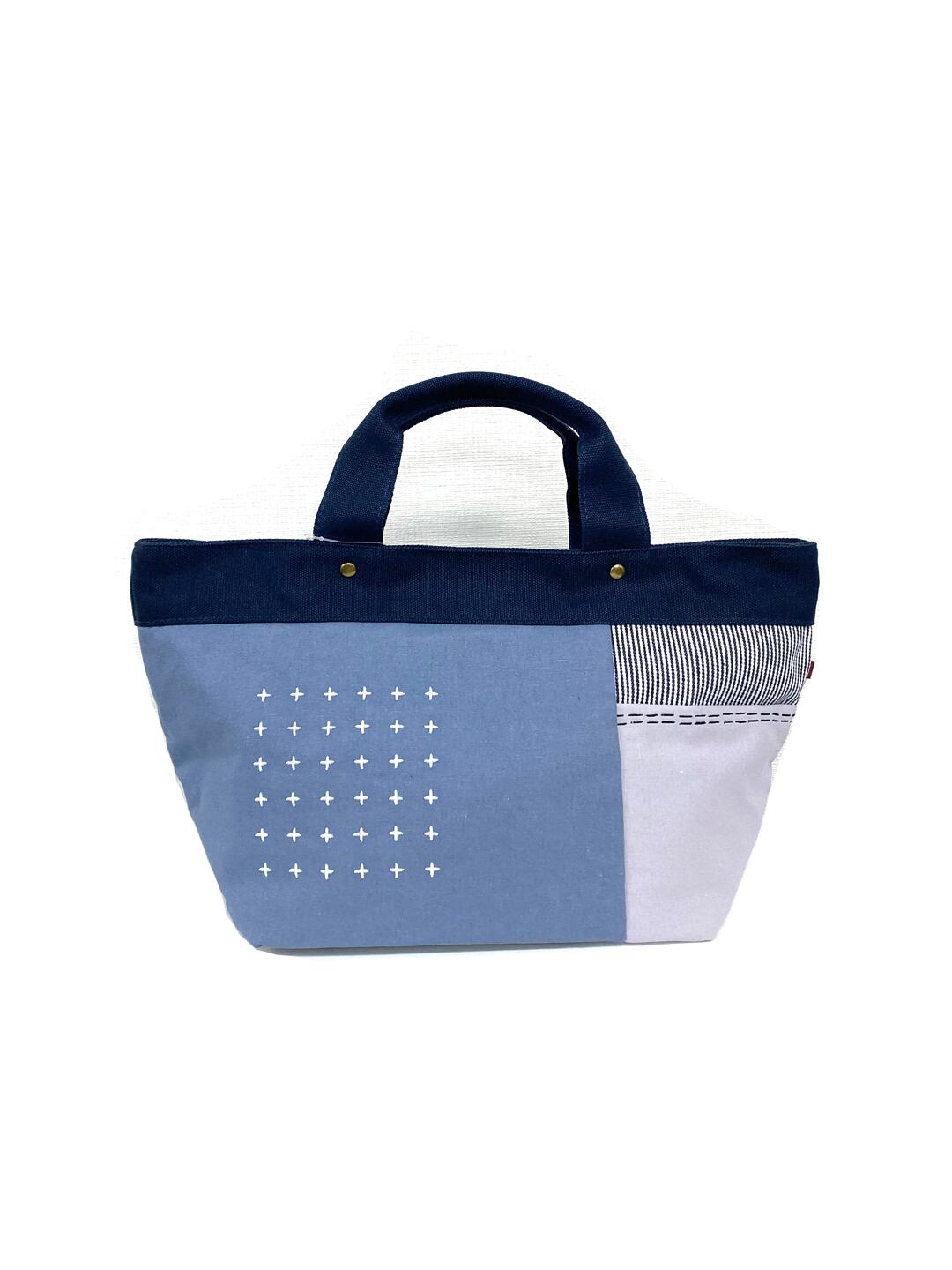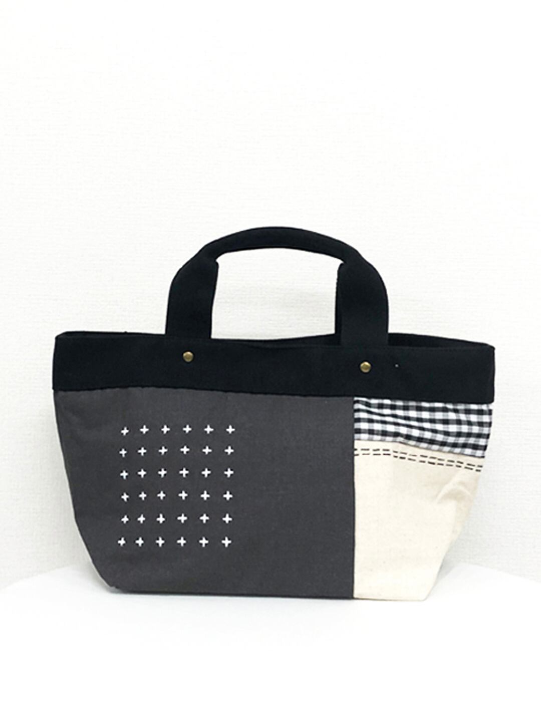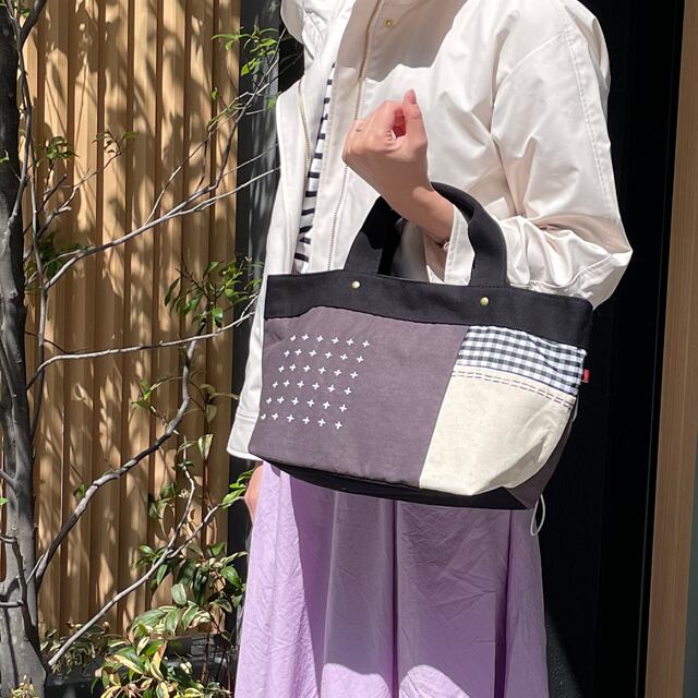 パッチワーク刺し子風ステッチ 綿 舟型手提げバッグ 全3カラー