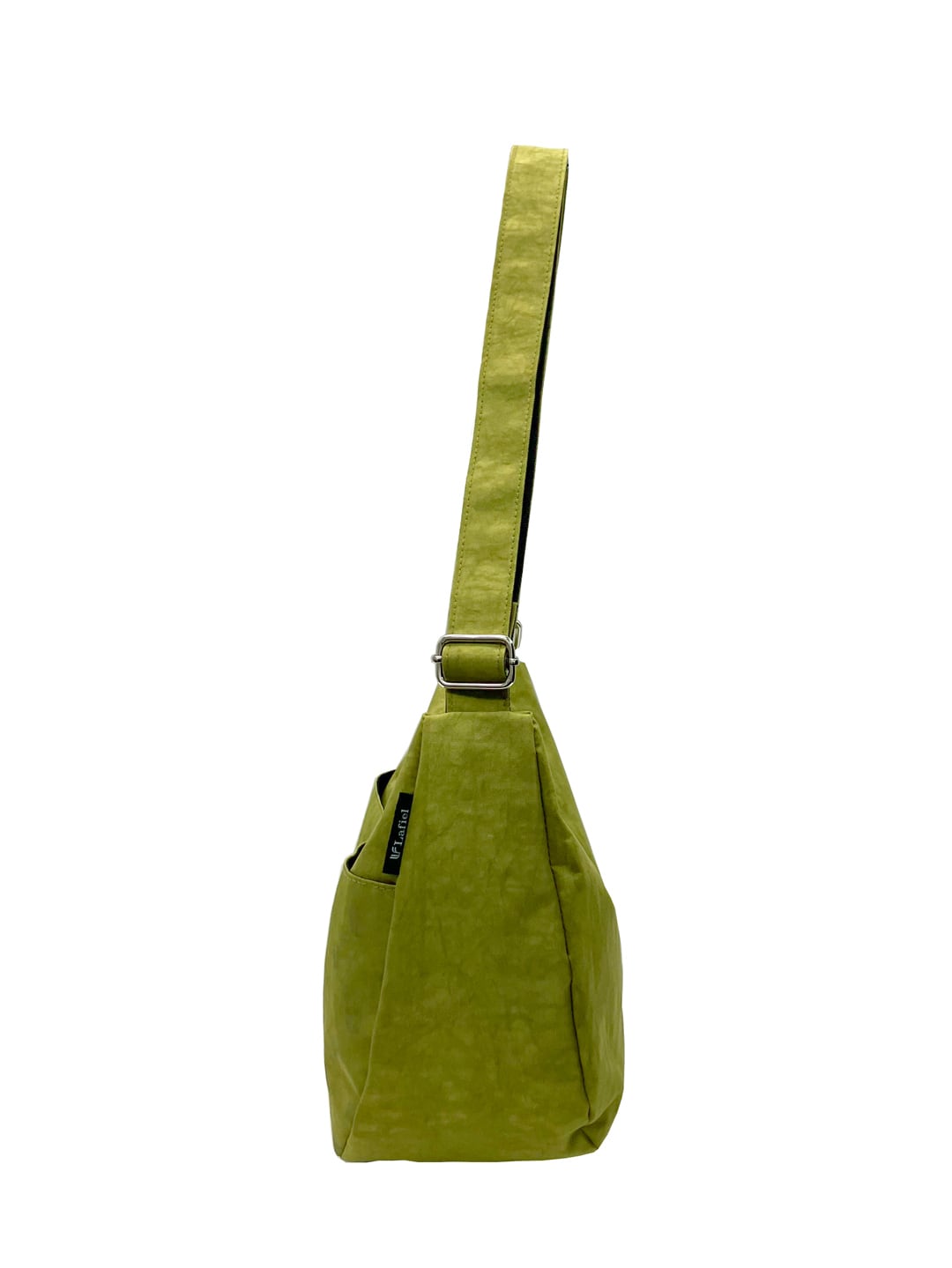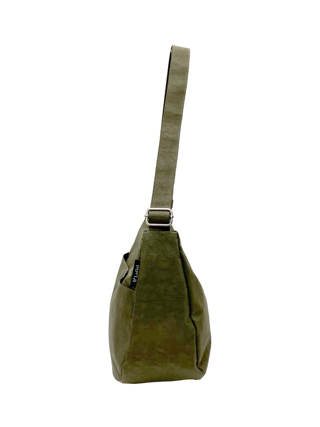 表情のあるしわナイロン調生地に同色のドットプリントで甘すぎないかわいさを表現。